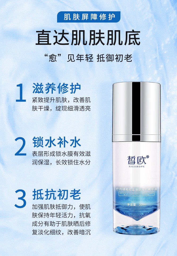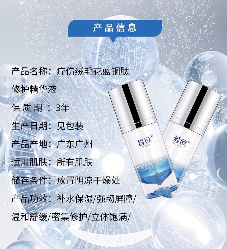 療傷絨毛花藍銅肽修護精華液具有出色的抗氧化作用,可以提亮膚色,細膩肌膚,防止肌膚老化。給予肌膚加倍平滑緊致的效果,有效緊致老化松弛肌膚,撫平細紋并預防細紋產生。改善老化膚質,延緩肌膚衰老,令肌膚緊實柔嫩,滋潤光滑,恢復年輕狀態(tài)。