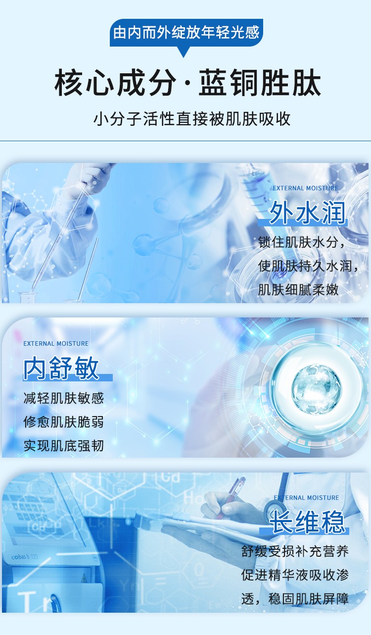 藍銅肽修護精華液吸收滲透率比較強,進入皮膚內部后,誘導纖維細胞產生膠原蛋白,促進膠原蛋白的生成能力強。它不僅可以撫平細紋并預防細紋產生,而且還可以充盈皮膚,細膩毛孔,再加上有控油的效果,非常適合油皮和混油皮來使用,很清爽,完全不油膩。